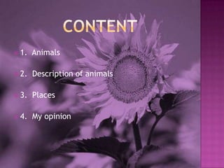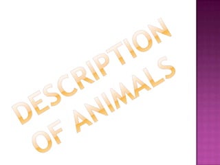 This document describes Camila Rodriguez's visit to the Panaca park in 2012. It includes descriptions of different animals seen at the park such as horses, rabbits, sheep, dogs, cows, turkeys, pigs, hens, goats, and llamas. Characteristics and behaviors of each animal are detailed. The areas where different classes of animals were kept, such as pigs in pigsties and chickens in the aviary, are outlined. Camila enjoyed seeing the variety of animals and learning about them, though she did not like that some animals seemed dirty or lacked proper living areas.