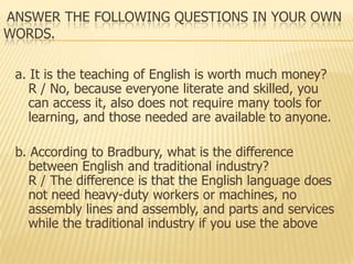 The document discusses the value of teaching English and compares it to traditional industry. It asks questions about the text and asks the reader to choose the correct answers.