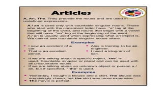 Articles are words that indicate a noun without describing it. There are two types of articles: definite ("the") and indefinite ("a", "an"). Articles modify nouns and anything acting as a noun. A compound noun is a noun made up of two or more existing words, such as "snowstorm".