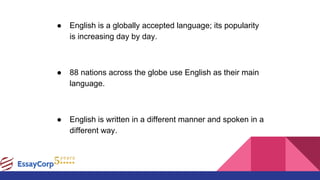 The document discusses the challenges of English as a subject and services provided by EssayCorp to help with assignments. Some difficulties with English include lack of vocabulary, improper punctuation, and difficulty comprehending various writers' works. EssayCorp offers essay writing, article writing, and letter writing services to assist students. They write essays, articles, and formal or informal letters to help improve English skills and complete assignments.
