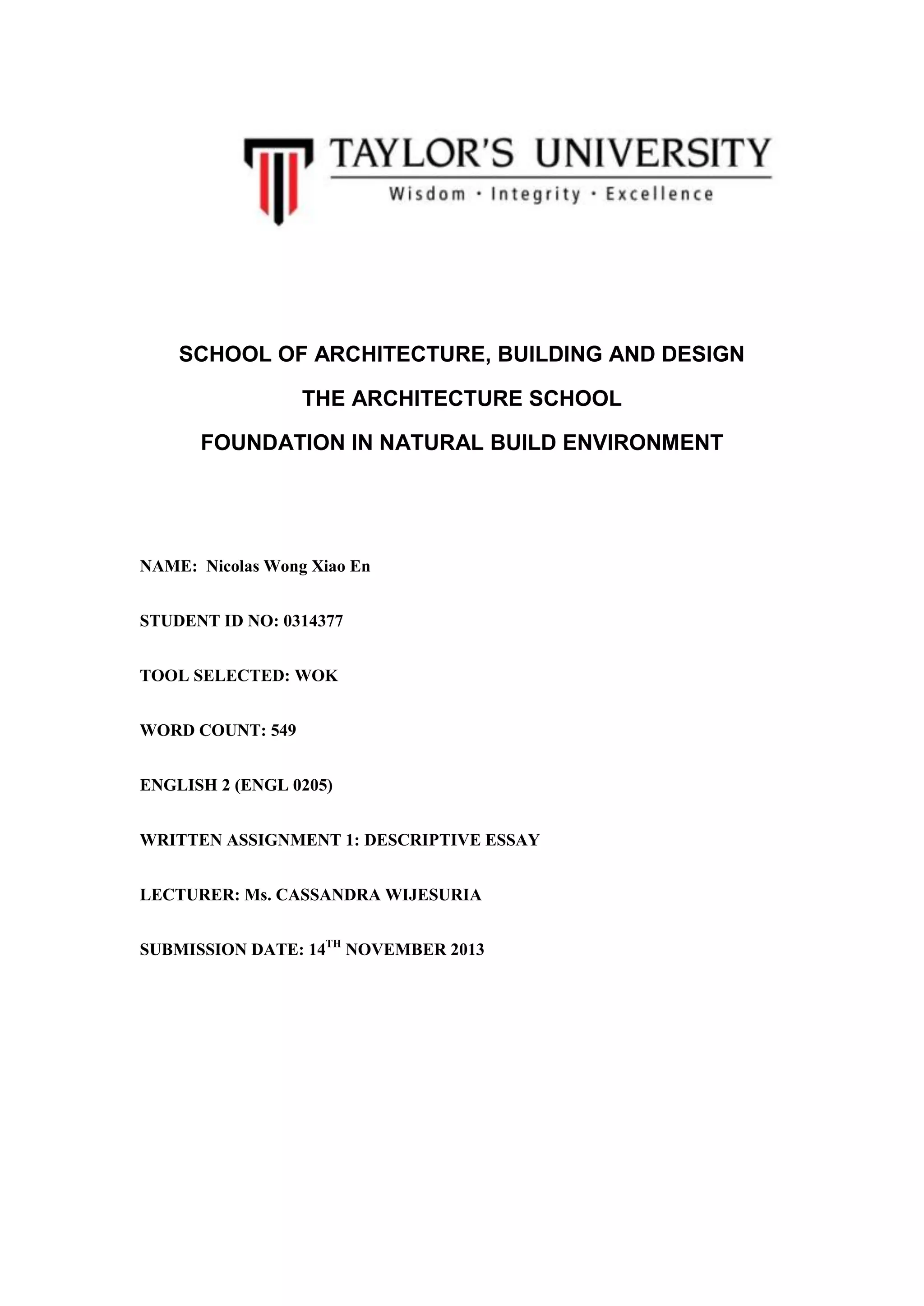 This document is a student's descriptive essay about exploring a wok in their kitchen at midnight. It is three paragraphs. In the first paragraph, the student describes picking up the wok and noticing its metal construction and plastic handle. The second paragraph has the student pretending the wok is a hat or shield and taking a selfie. The third paragraph details cooking an egg in the wok and burning a finger, realizing they need to finish their assignment due the next day.
