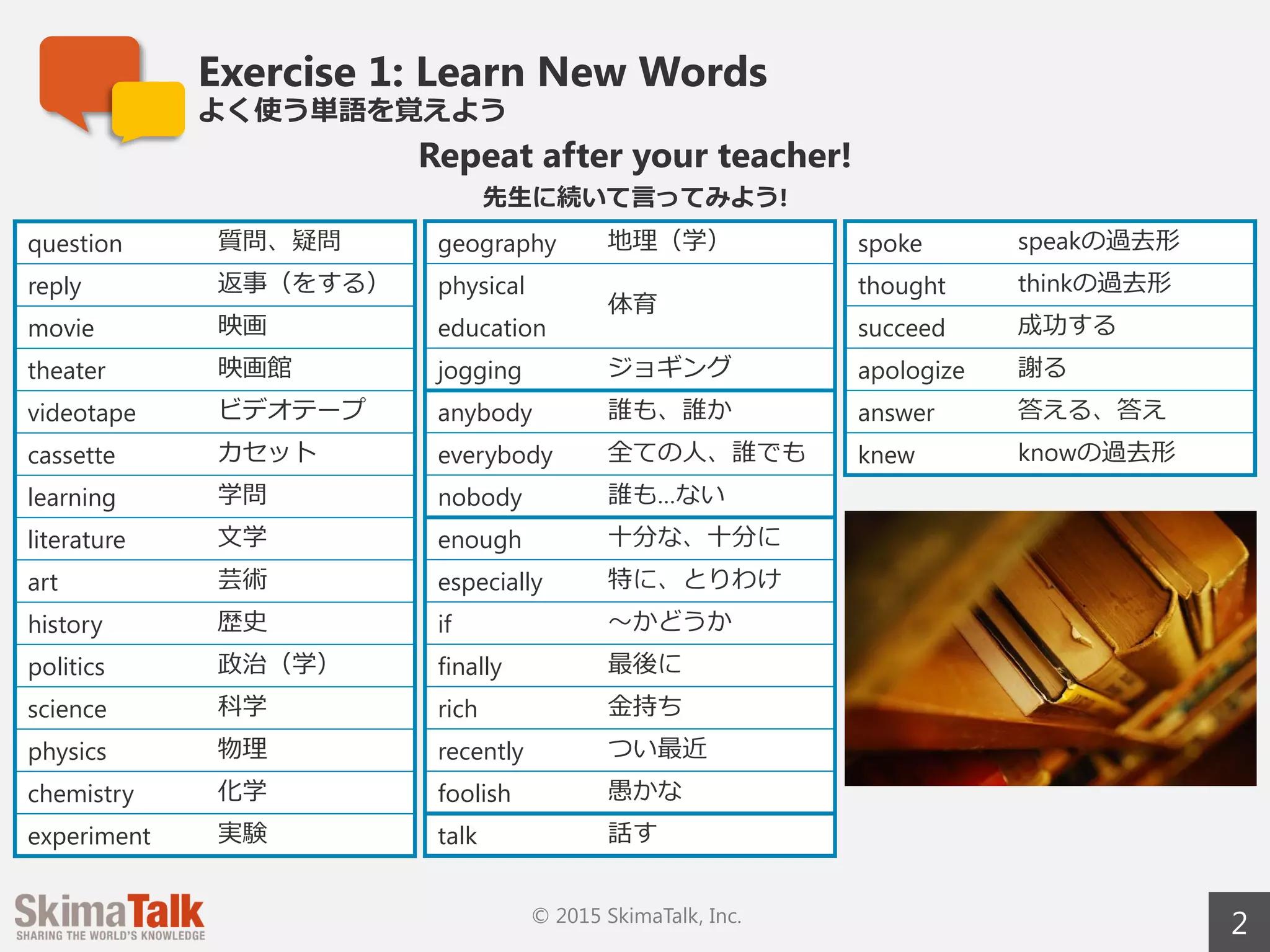 New Words よく使う単語を覚えよう 2© 2015 SkimaTalk, Inc. Repeat after your teacher! 先⽣生に続いて⾔言ってみよう! question 質問、疑問 reply 返事(をする) movie 映画 theater 映画館 videotape ビデオテープ cassette カセット learning 学問 literature ⽂文学 art 芸術 history 歴史 politics 政治(学) science 科学 physics 物理理 chemistry 化学 experiment 実験 geography 地理理(学) physical 体育 education jogging ジョギング anybody 誰も、誰か everybody 全ての⼈人、誰でも nobody 誰も…ない enough ⼗十分な、⼗十分に especially 特に、とりわけ if 〜~かどうか finally 最後に rich ⾦金金持ち recently つい最近 foolish 愚かな talk 話す spoke speakの過去形 thought thinkの過去形 succeed 成功する apologize 謝る answer 答える、答え knew knowの過去形