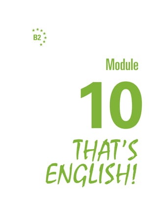 This document provides an introduction to the structure and content of Module 10 of the That's English coursebook. It explains that each unit follows the same basic format, beginning with a video section to develop listening comprehension skills, followed by reading, language study, speaking and writing activities to practice other skills. The introduction emphasizes developing a balanced approach to learning grammar alongside communicative skills. It encourages students to engage actively with all elements of the course and not be afraid of making mistakes. Repeated exposure to language through a variety of interactive tasks is emphasized as the best way to improve English ability.