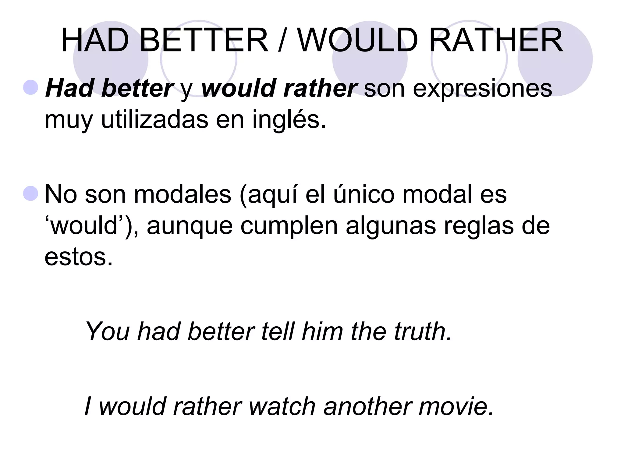 This document provides information on the use of "had better" and "would rather" in English. It explains that "had better" is used to advise something is preferable, using the present or future tense. "Would rather" expresses preference, using "would prefer" for specific preferences and "prefer" for general preferences. Examples of the structures and contractions of "had better" and "would rather" are given. The document also covers three types of conditionals in English - zero, first, and second conditionals - and provides examples of how to form sentences using each one. Exercises are included for learners to practice using "had better", "would rather", and the different conditional structures.
