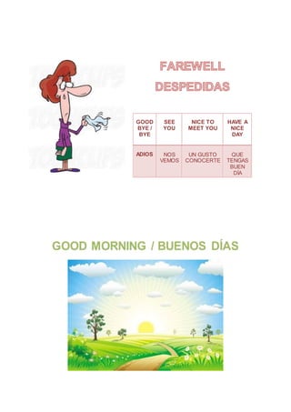 YOU HAVE A NICE DAY ADIOS NOS VEMOS UN GUSTO CONOCERTE QUE TENGAS BUEN DÍA