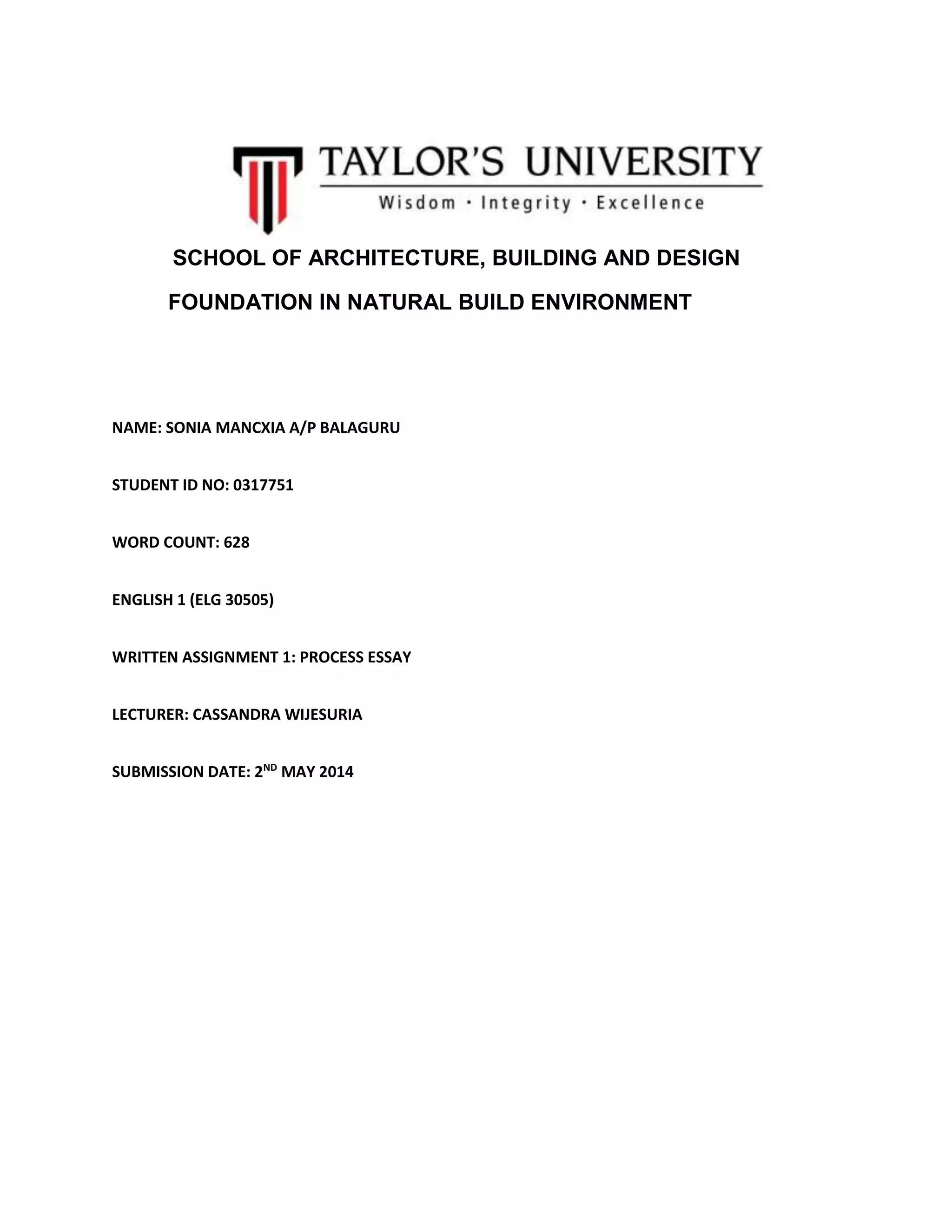 The document is a 628-word process essay by a student named Sonia Manxcia describing her process of sketching the Eiffel Tower. She began by researching famous buildings and choosing the Eiffel Tower. After clearing her work area, she laid out drawing tools and started with a rough sketch using a soft pencil. With grids, she corrected proportions and added structure with a harder pencil. Finally, she added details, shades, and landscape, smoothing shades with her finger for a softer look. The whole process took 3 hours.