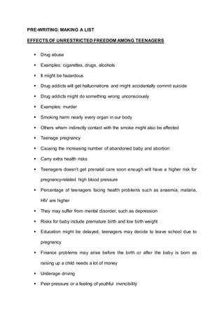 The document discusses the effects of unrestricted freedom among teenagers, including drug abuse, teenage pregnancy, and underage driving. It argues that providing teenagers with complete freedom could lead them to make poor decisions like abusing drugs, engaging in unprotected sex and becoming pregnant, or driving recklessly due to peer pressure. Such behaviors could significantly harm their health, education prospects, and development into mature adults. Therefore, the document concludes that some restrictions on teenage freedom are necessary to protect them from harmful outcomes.