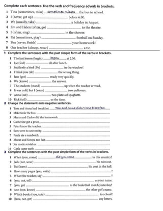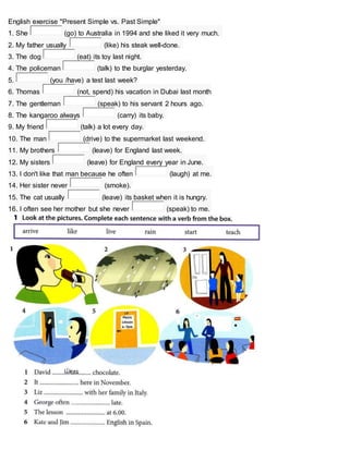 This document provides examples sentences using the present simple and past simple tenses in English. It contains 16 sentences with subjects performing various actions, with some in the past tense using words like "yesterday", "last night", and others in the present tense using words like "usually", "always", and "often" without a specific time stated. The document is an exercise contrasting the use of the present simple and past simple tenses in English sentences.