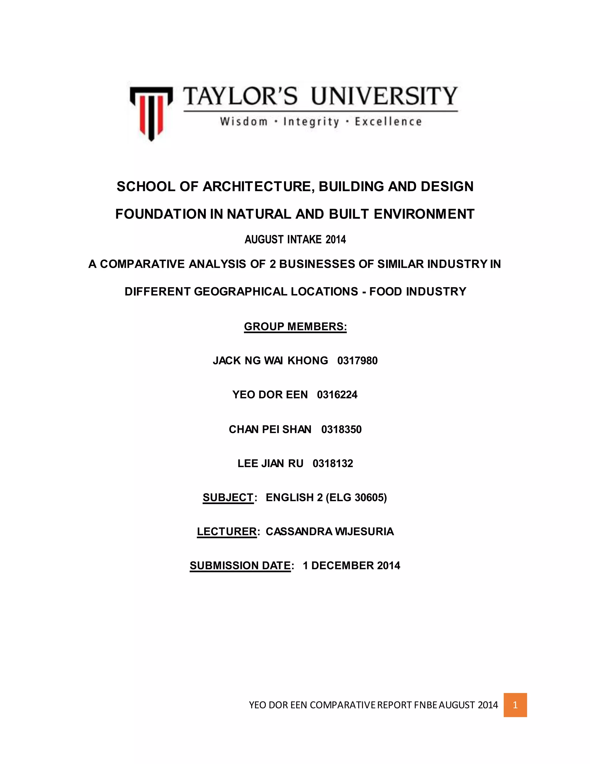 This document is a comparative analysis report on two noodle shops located in different areas - Yee Kee Beef Noodles in Seremban and SRK Noodle House in Klang Valley. The report provides details on the businesses such as their locations, products, number of employees, customers. It also compares their competitive traits such as number of competitors, market shares, strategies to compete. The businesses were founded generations ago and their founders' motivation was to spread their original noodle recipes. Both businesses are expanding with Yee Kee venturing to KL and SRK opening a new branch in December.