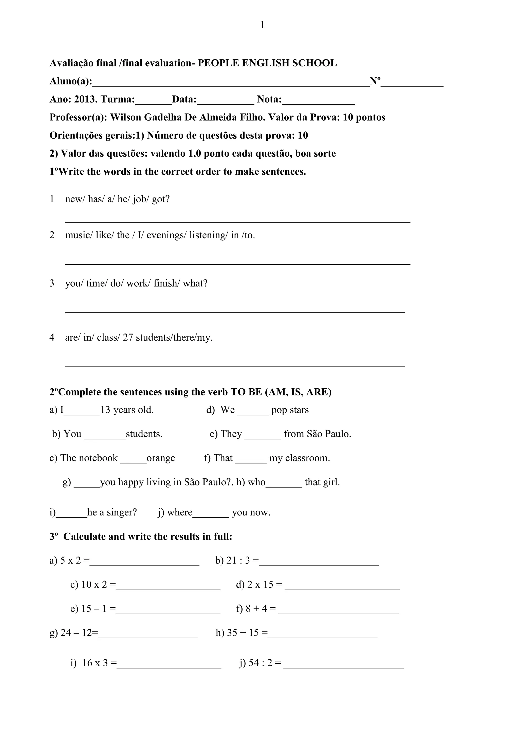 This document contains a final evaluation for an English language student. It consists of 10 sections testing various language skills including sentence formation, verb conjugation, vocabulary, grammar, and reading comprehension. The evaluation contains questions, sentences to complete, and short passages to read, with the goal of assessing the student's English proficiency across multiple areas.