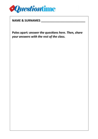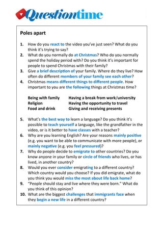 The document contains 10 questions about Christmas traditions, family, language learning, immigration, and challenges immigrants face. It asks about the respondent's normal Christmas activities, importance of family, best ways to learn a language, reasons for learning English, why people emigrate, if they would consider emigrating themselves and where, opinions on immigration, and biggest challenges immigrants face in new countries. The questions cover a wide range of topics about cultural traditions, personal experiences, and perspectives on immigration.