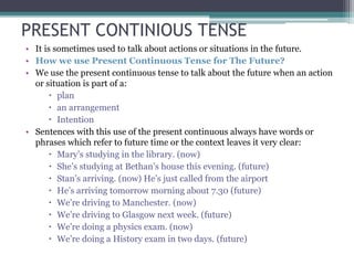 This document discusses different ways to talk about future events in English, including the present continuous tense, "be going to", simple future, and present simple tense.