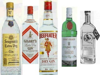 Gin originated in the 16th century when English soldiers brought it from the Netherlands. It grew rapidly in popularity in England during the 17th-18th centuries until acts of Parliament in the 1730s-1750s taxed and regulated gin production and sales. Gin is produced by infusing juniper and other botanicals into a neutral grain spirit. Common botanicals include coriander, angelica, cassia bark, orris root, and citrus peels. Gin can be flavored through either a head or cold mix method before aging. Popular gin brands include Gordon's, Tanqueray, and Bombay Sapphire. Plymouth gin uses local soft water in its production process. Flavored varieties