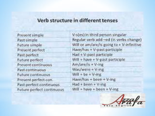 This document provides a summary of English grammar concepts including word classes, sentence structures, direct and indirect objects, the present continuous tense, present simple tense, past simple tense, present perfect tense, present perfect continuous tense, past perfect tense, past perfect continuous tense, future tenses including will, going to, present continuous, present simple, and yes/no question forms. It defines each concept and provides examples.