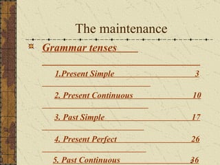 This document provides a summary of various English verb tenses including the present simple, present continuous, past simple, present perfect, and past continuous. It defines when each tense is used, how to form the affirmative, negative, and interrogative forms, and provides examples. Key points covered include using the present simple for regular actions, present continuous for ongoing actions, past simple for completed past actions, present perfect for unfinished past actions, and past continuous for background ongoing past actions. Links to online exercises are also provided to test understanding of each tense.