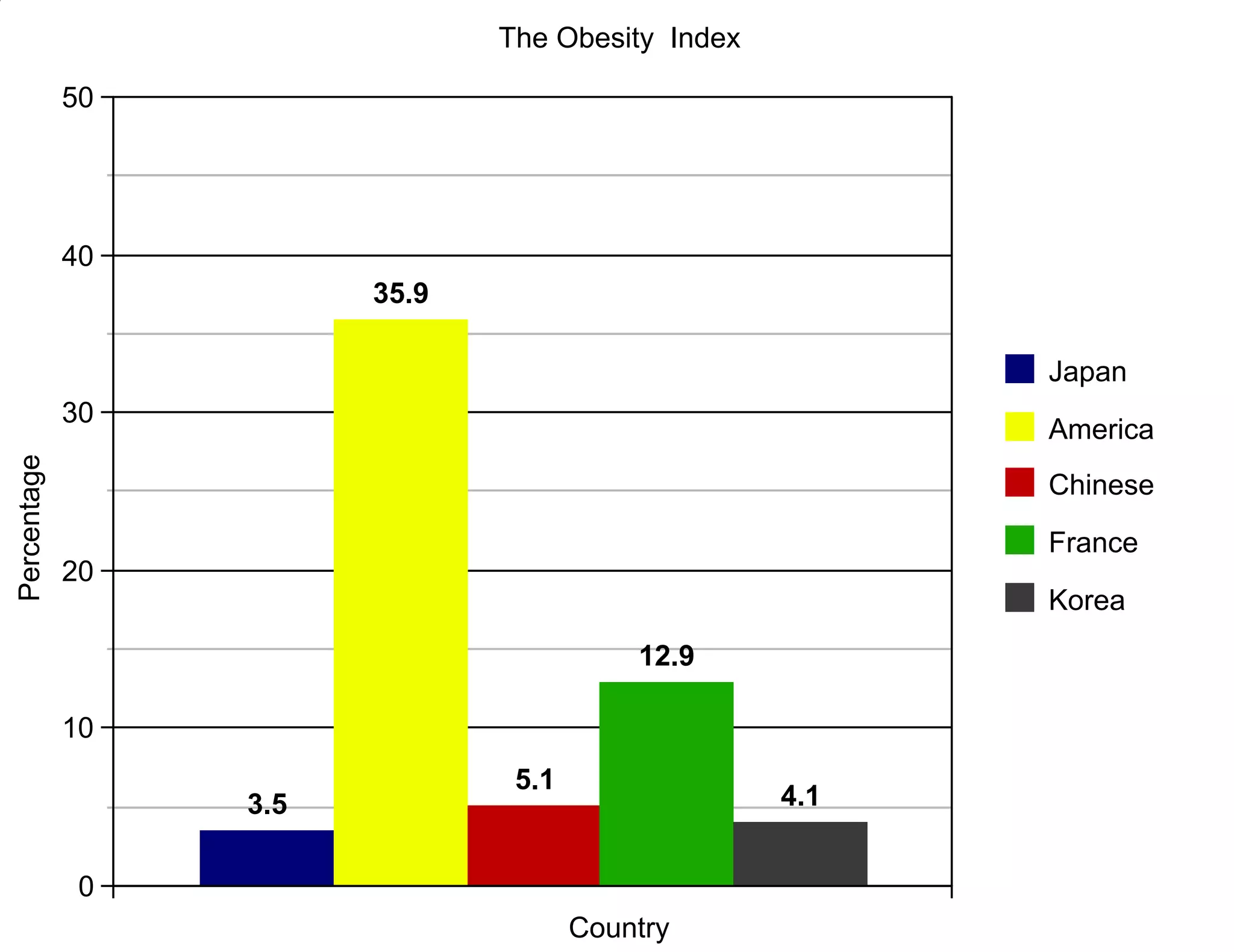The document shows a bar graph comparing obesity rates across several countries. America has the highest obesity rate at 35.9%, while Korea has the lowest at 3.5%. Japan, China, and France all have obesity rates between 10-20%, significantly lower than America.