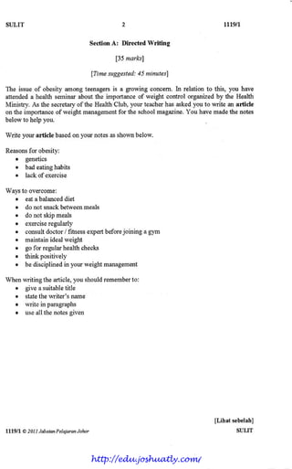 The document discusses a test paper for the Malaysian Education Ministry's 2011 Primary School Achievement Test. The test consists of 4 sections (A, B, C, D) with different time allocations and questions types. Students are instructed not to open the test paper until told to and to answer all questions within the time limits for each section.