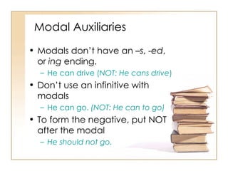 The document discusses English modal auxiliary verbs such as can, could, may, might, must, should, ought to, shall, will, and would. It provides examples of their common uses to express ability, permission, possibility, necessity, advice, requests, predictions, promises and more. The meanings and appropriate uses of each modal verb are defined.