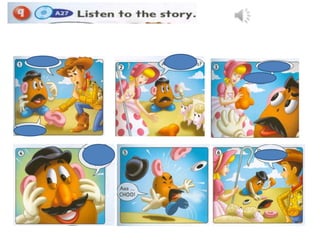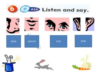 This document teaches basic facial expressions for emotions like happy, sad, surprised, tired and angry through illustrations of faces showing different combinations of eyes, mouths, noses and ears. It instructs the reader to listen, then practice drawing the facial expressions, and finally to draw their own face showing an emotion.