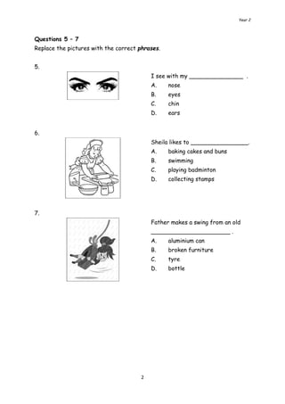 This document contains a 40 question multiple choice exam covering topics like vocabulary, grammar, reading comprehension, and spelling. The questions test knowledge of subjects like food, occupations, family, hobbies, numbers, and punctuation. There is also a short reading passage about children's ambitions and a letter discussing travel plans between family members. Students must choose the best answer from the options provided to demonstrate their understanding of the content.