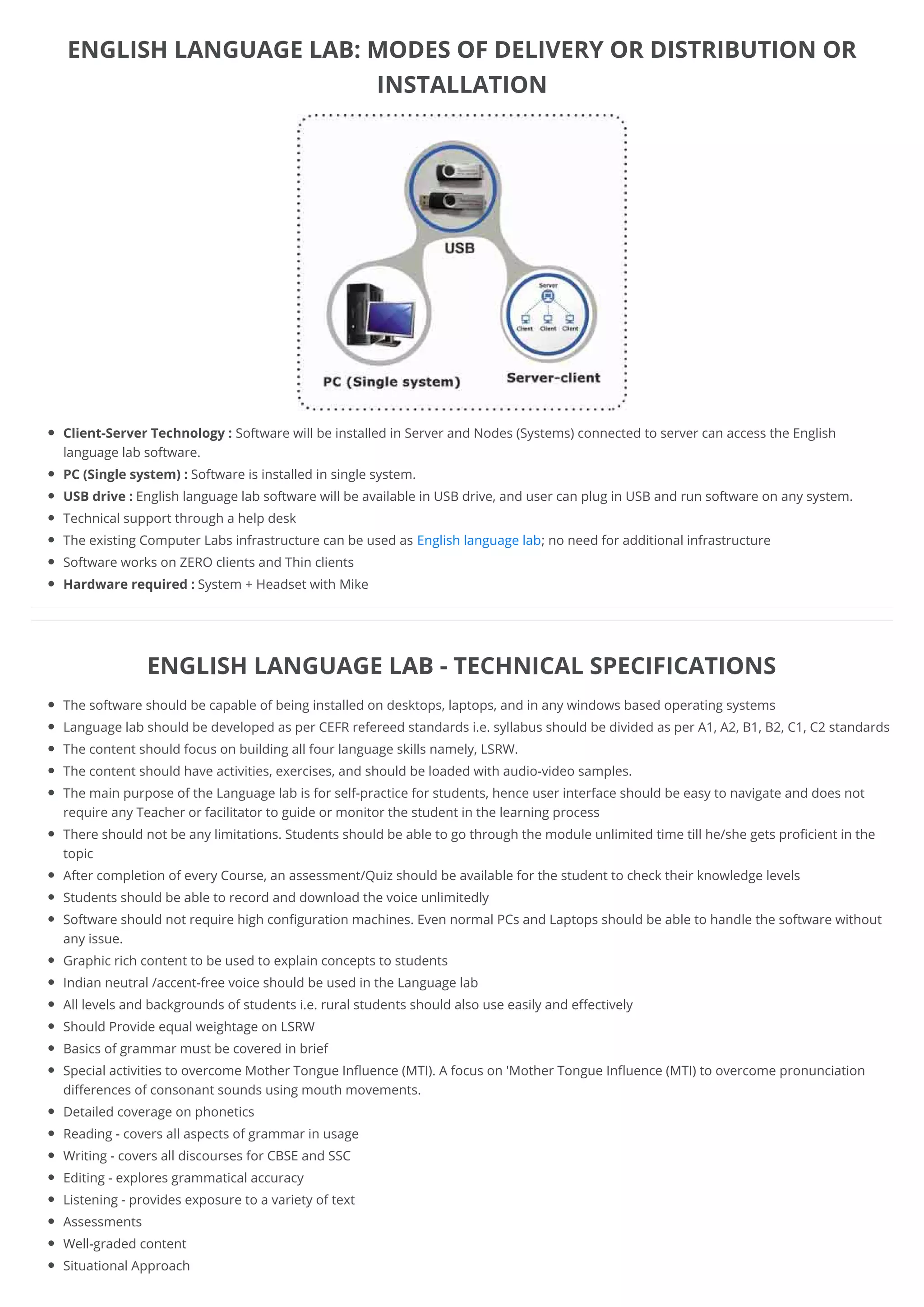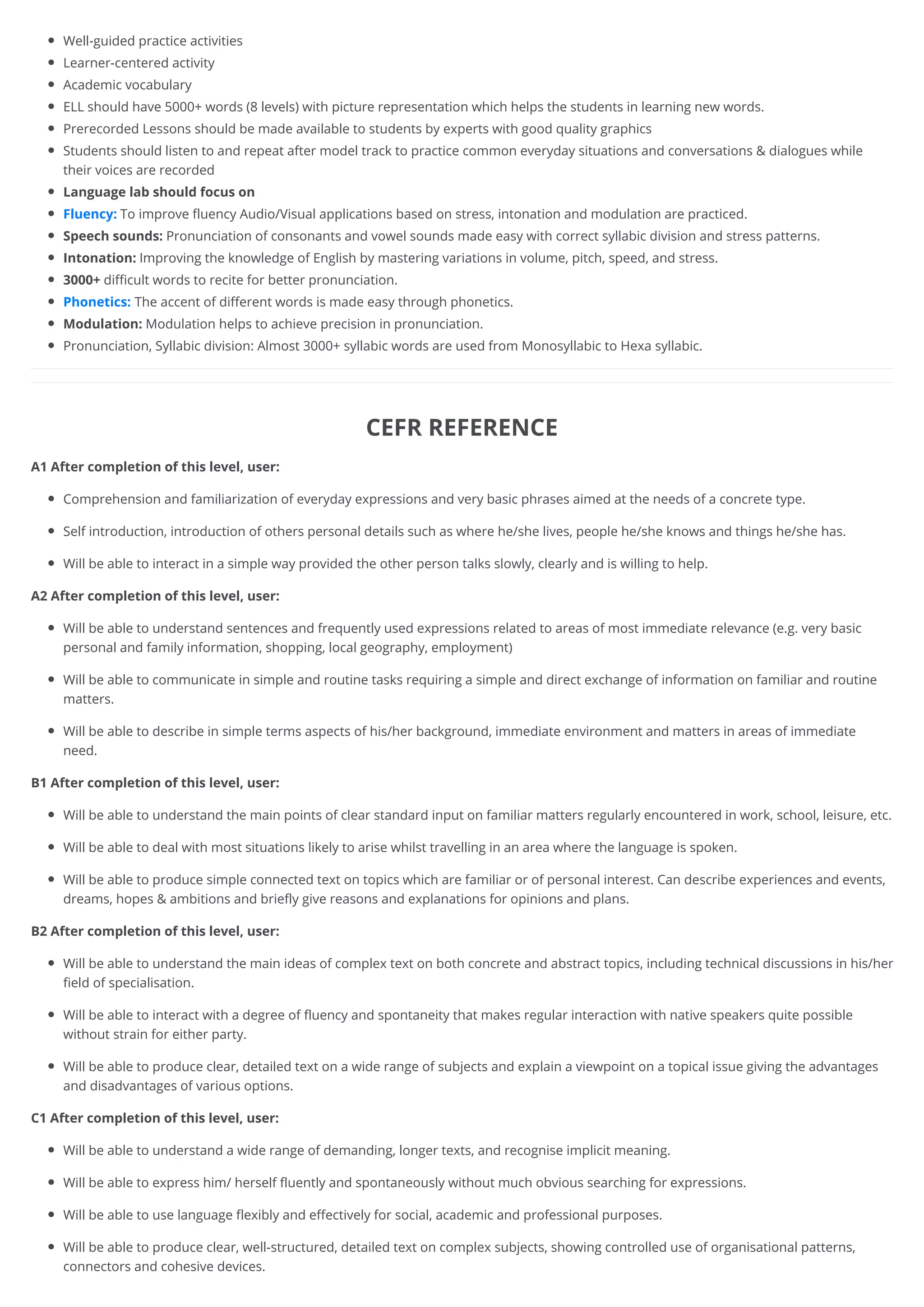 The document outlines the features and specifications of an English language lab software designed for various systems including servers, PCs, and USB drives, emphasizing ease of use and access for students across different backgrounds. It follows CEFR standards for language proficiency, providing a structured approach to learning with focus on improving skills in listening, speaking, reading, and writing (LSRW), and includes assessments for knowledge evaluation. Key features include activities for pronunciation, grammar, and vocabulary enhancement, along with multimedia resources to aid self-practice in an engaging and user-friendly manner.