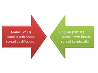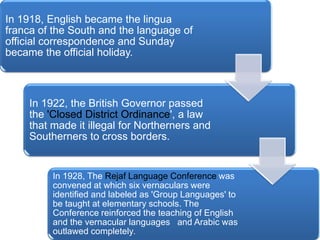 The document discusses the teaching of English language in Sudan. It covers the course content for English language teaching, key terms related to English teaching, and the changing status and policies around English in Sudan over time. Specifically, it notes that under British rule in northern Sudan, some primary and intermediate schools taught English, while education was left to missionaries in southern Sudan. It also describes the linguistic diversity in Sudan and how civil wars impacted language policies and the priority given to English teaching between northern and southern regions of the country.