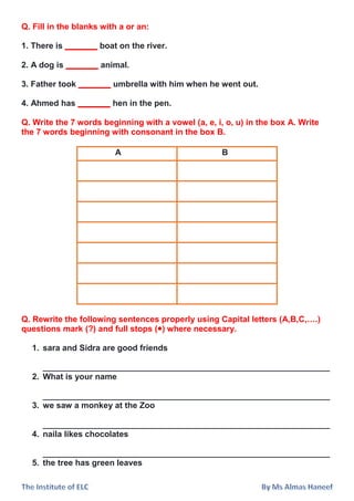The document is a collection of language exercises aimed at teaching students about grammar, including identifying nouns, verbs, and articles. It includes various tasks such as underlining, matching pictures, filling in blanks, and rewriting sentences correctly. The exercises cover topics such as capitalization, punctuation, and vocabulary development.