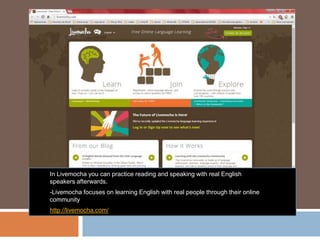 This document provides summaries of 15 online resources for learning English, including Duolingo, Livemocha, ESL Café, BBC Learning English, and others. It summarizes the key features and purpose of each site such as providing lessons, games, quizzes, opportunities to practice with native speakers, news articles, dictionaries, and more. All resources are available for free online and aim to help improve English skills through interactive and engaging learning activities.