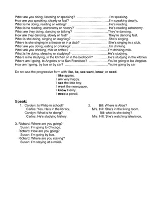 The document provides examples and practice exercises for using the present progressive tense to describe actions that are occurring now, including asking information questions using what, where, and how. Students are given pictures and short dialogues to practice forming yes/no and information questions in the present progressive about common actions like reading, speaking, dancing, and traveling.