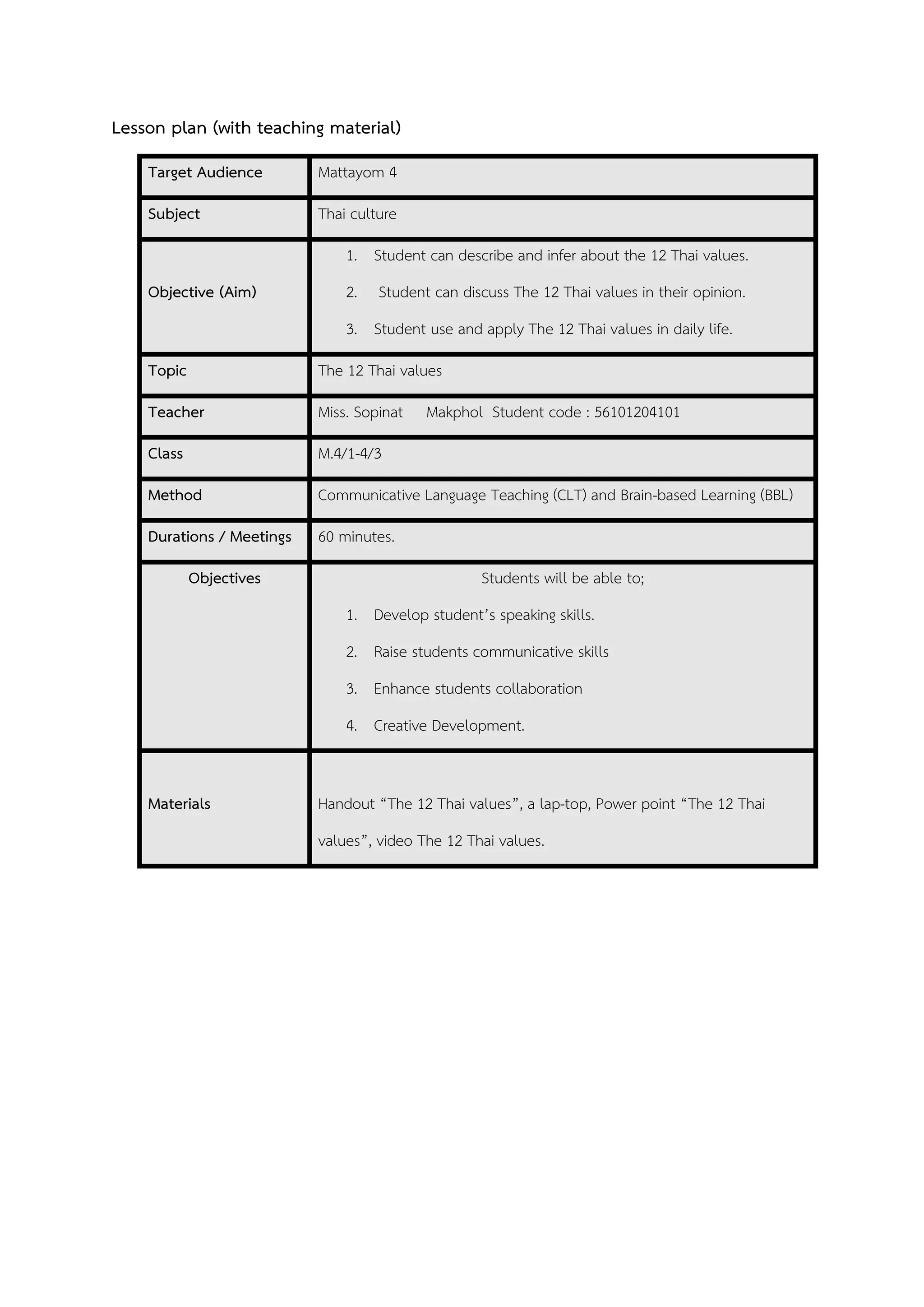 This lesson plan aims to teach Mattayom 4 students about the 12 core Thai values over the course of a 60-minute class. The lesson will begin with a warmup activity to introduce the topic of values in Thailand. Students will then receive a handout explaining each of the 12 Thai values while the teacher presents on their meanings. Next, students will work in groups to discuss the values and their personal opinions on them. To conclude, students will share their group's views on the values and vote on their most important one while the teacher summarizes what was learned. The lesson's goals are for students to understand, discuss, and apply the 12 core Thai values in their daily lives.