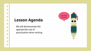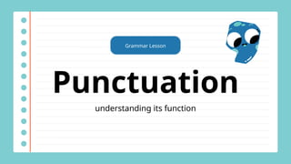 The document is a grammar lesson focused on punctuation, explaining its various functions and providing examples for each type. Key punctuation marks discussed include periods, exclamation points, question marks, commas, semicolons, ellipses, quotation marks, apostrophes, and colons. The lesson emphasizes the importance of correct punctuation in writing.