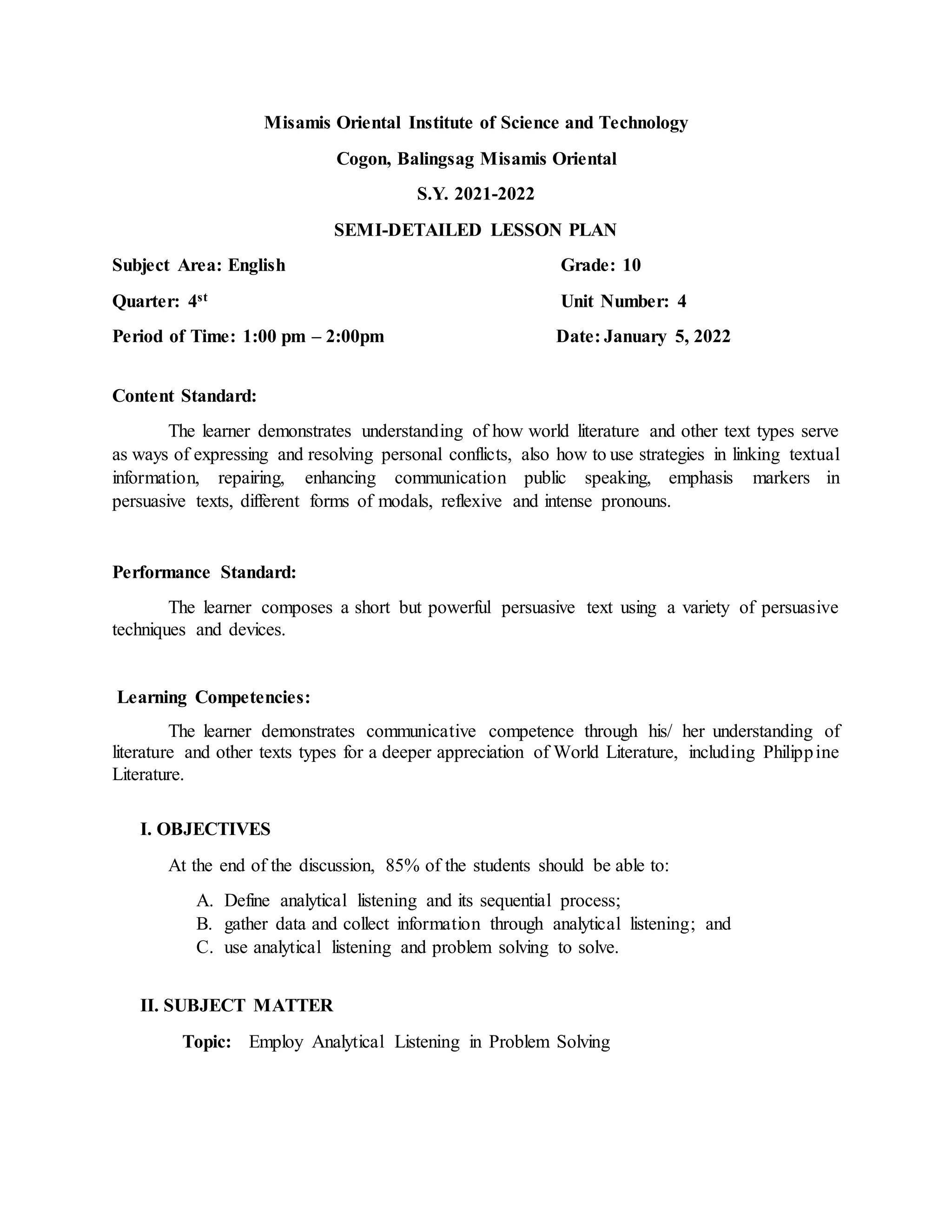 The document provides a semi-detailed lesson plan for an English class. The lesson plan aims to teach students about analytical listening and how to use it in problem solving. Key points of the lesson include defining analytical listening, its sequential process, and importance. Students will listen to a song and identify a moral lesson. They will also watch a video on climate change and identify problems and solutions in a table. The lesson aims to help students value analytical listening in problem solving. An evaluation involves students answering questions to test their understanding of analytical listening concepts and steps to solving a problem.