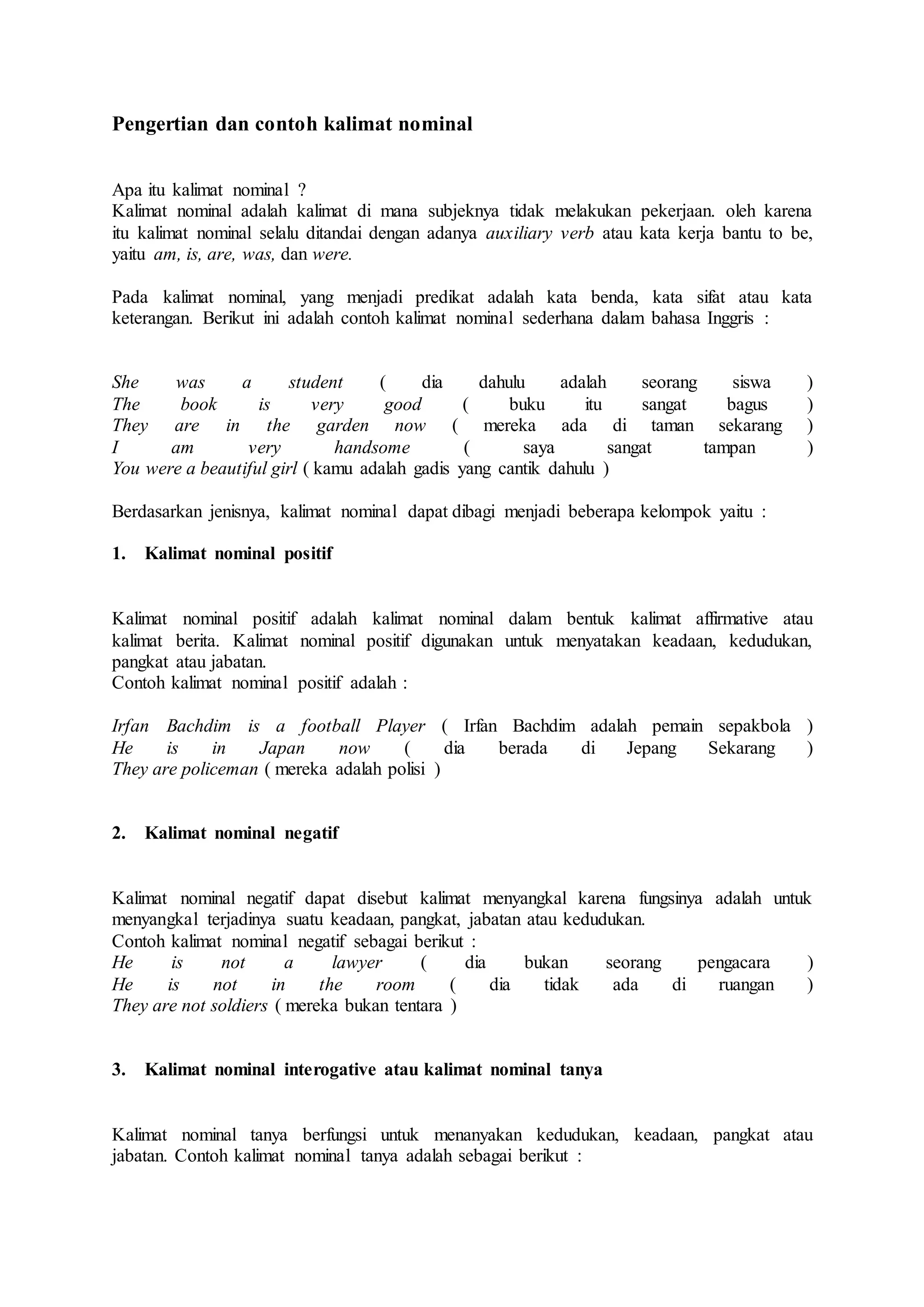 Dokumen ini menjelaskan tentang kalimat nominal dan kalimat verbal dalam bahasa Inggris, termasuk definisi, contoh, dan perbedaan antara keduanya. Kalimat nominal adalah kalimat yang tidak mengungkapkan tindakan, sedangkan kalimat verbal menunjukkan aksi dari subjek. Pemahaman kedua pola kalimat ini penting untuk menguasai tata bahasa Inggris.