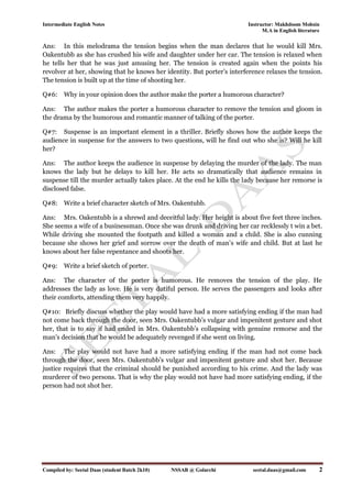 The document presents detailed notes on three literary texts, including a melodrama by Frank Arthur about Mrs. Oakentubb, a reflection by Bertrand Russell on the historical shifts of power between the East and West, and a humorous account by James Thurber about a panic caused by a rumor of a broken dam. Each section includes analyses of themes, character sketches, and critical questions related to the works. The overarching focus is on understanding the narratives, their cultural significance, and the psychological elements involved in human reactions.
