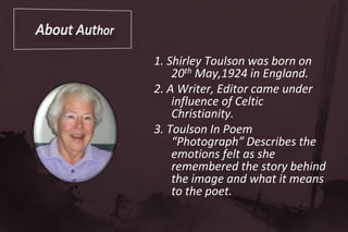 The poem describes the poet remembering a photograph of her mother from her childhood at the beach with her cousins. The photograph brings back memories of her mother's happy face before her death. Now, years later, the poet feels the "laboured ease of loss" as she has been without her mother for as long as the woman in the photograph lived. The finality of death leaves one speechless, as expressed by the silence at the end.