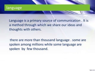 English is a West Germanic language that originated in England and is now a global lingua franca. It is the most commonly spoken language worldwide, with the highest number of native and total speakers. English has spread around the world through British imperialism from the 17th to 20th centuries and the emergence of the United States as a superpower. It has become the dominant language of international discourse and is easier to learn than many other languages. Knowing English provides career opportunities and is required for attending foreign universities, while also allowing access to more of the internet and entertainment.