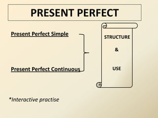 The document summarizes the structure and use of the present perfect simple and present perfect continuous tenses in English. The present perfect simple uses the auxiliary verb "have" plus the past participle, and is used to describe actions that began in the past and are still relevant now. The present perfect continuous uses "have/has been" plus the gerund, and describes actions that started in the past and continue in the present. Some examples of the tenses' uses are also provided.
