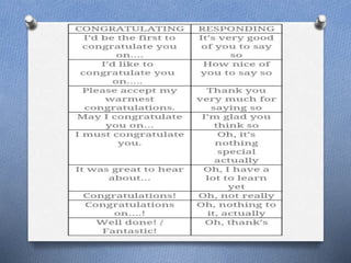 This document discusses expressions used to congratulate, compliment, show care, and introduce oneself in English. It provides examples of congratulating someone for winning a competition or placing third. It also gives examples of complimenting someone on modifying their motorcycle and making it look better. Finally, it lists ways to express sympathy, happiness, and introduce yourself in English conversations.