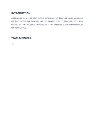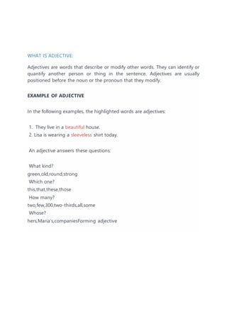 3) There are different types of adjectives including typical endings, denominal adjectives, comparative/superlative forms, compound adjectives, and ordering of adjectives.
