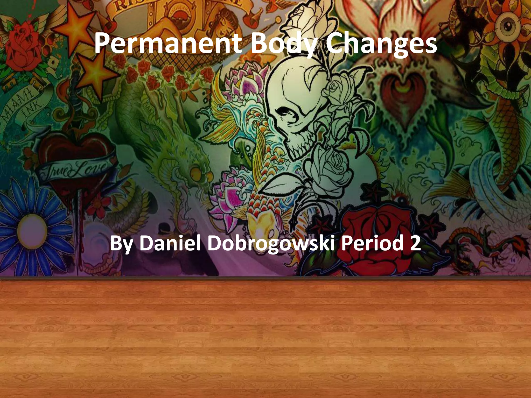 This document discusses permanent body modifications like tattoos and piercings. It provides general information on tattoos, piercings, and why they have become more popular. Teens often get tattoos and piercings to express themselves or fit in. However, there are health risks like disease transmission or allergic reactions. The document also interviews a student who regretted his tattoo and discusses removal options like covering up with another tattoo or expensive laser removal.