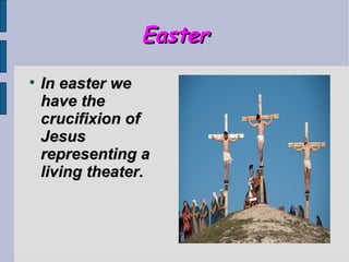 This document discusses holidays and activities in Cuevas del Campo. It mentions that Easter celebrates Jesus' crucifixion with a live theater. In May, the feast of San Isidro is celebrated with children's games and a pilgrimage. In the summer, visitors can go to the Negratin swamp with nude and textile beaches, go canoeing, and eat at two restaurants. Hiking trails include Rivel, Puntal Blanco, and Rambla. Lodging is available in the famous cave houses.