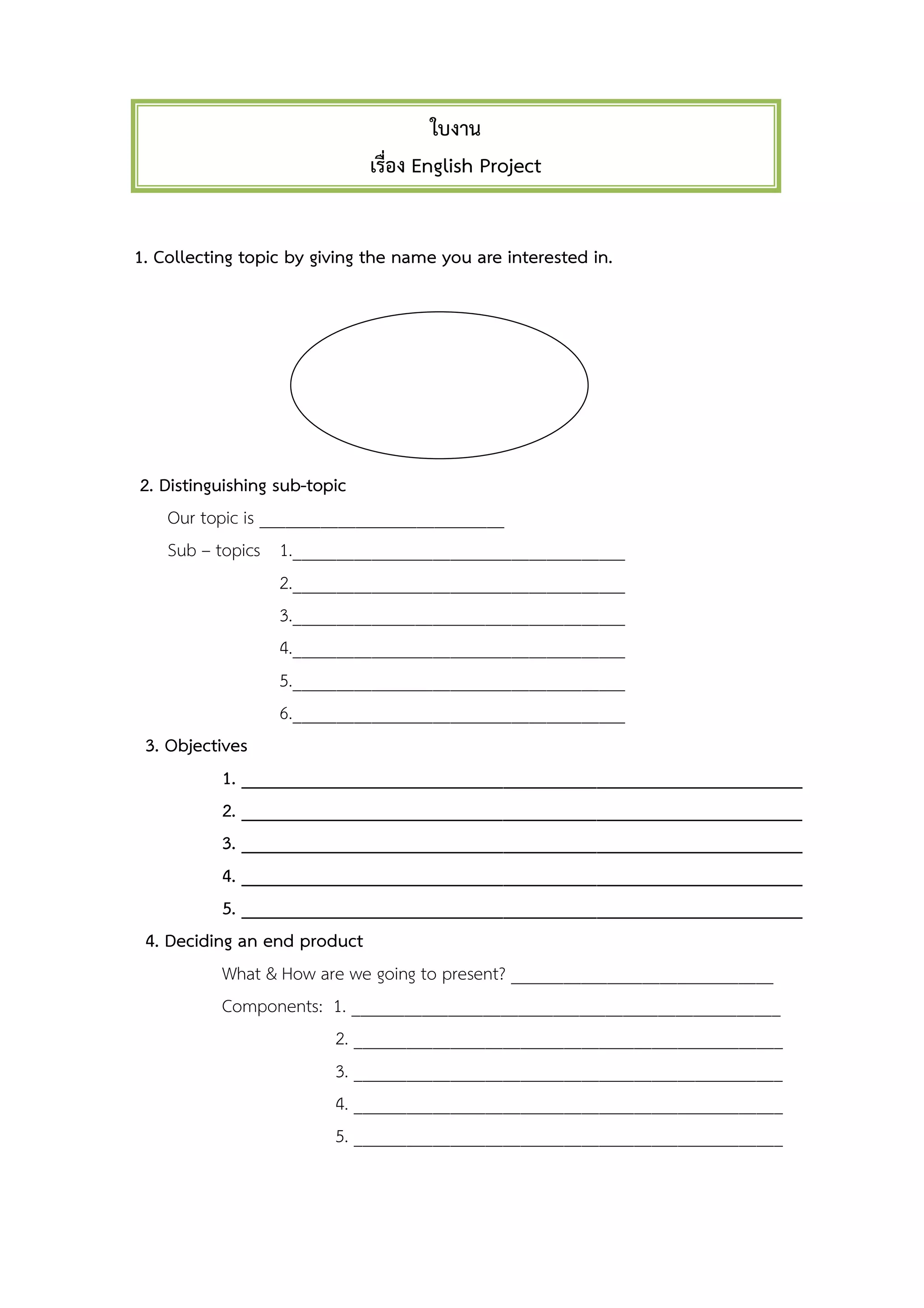 The document outlines the steps for an English project, including collecting a topic and sub-topics, setting objectives, deciding on an end product, determining necessary information and sources, creating a timeline, assigning tasks to group members, and listing required materials. It provides a structured approach to planning and organizing the various components of a group project.