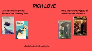 The document summarizes 5 books that deal with the themes of love and wealth: