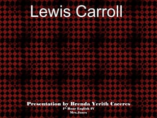 The document provides biographical information about Lewis Carroll, the author of Alice's Adventures in Wonderland and Through the Looking Glass. It summarizes his works, personal struggles and unhealthy relationship with young girls. Excerpts from Jabberwocky and Alice's Poem are presented along with analysis of themes, poetic devices and meaning. Works cited are listed at the end.
