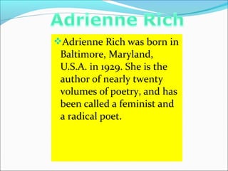 Adrienne Rich was an American poet born in 1929 in Baltimore, Maryland. She authored nearly twenty volumes of poetry and was considered a feminist and radical poet. The poem describes trees that have been inside a house moving back out into the forest at night. As the trees' roots disentangle and branches shift, the poet sits inside writing letters without directly mentioning the departure of the forest. By morning, the once empty forest will be full of trees again.