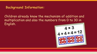 This document outlines a lesson plan for a 2nd grade class to practice counting in English. The lesson has three activities: 1) a bingo game to review numbers 0-30, 2) using hands to count in groups to reinforce addition, and 3) an online skip counting activity to practice multiplication. The lesson aims to develop math skills while using English vocabulary. It assesses if students can identify and say numbers in English, understand addition and multiplication, and answer questions using count nouns and numbers. The teacher reflects that students enjoyed bingo and counting on hands but ran short of time for the online activity.