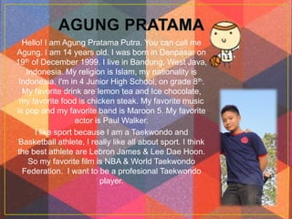 The document introduces several students from Bandung, Indonesia. It provides their names, ages, birthplaces, religions, schools, hobbies, favorite foods, drinks, music, movies, sports and future aspirations. Each student introduction is 2-5 sentences in length.