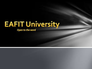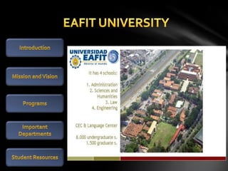 EAFIT University was founded in 1960 by business leaders to educate professionals to serve Colombia. It has four schools and is located in Medellin with 22 buildings and laboratories. EAFIT's mission is to contribute to Colombia's development through undergraduate and graduate programs in fields like engineering, business, sciences and law, to educate competitive graduates through research with academic and private sectors.