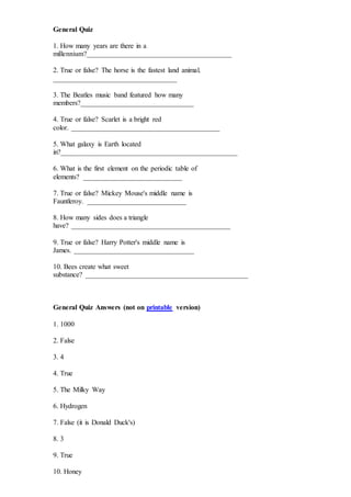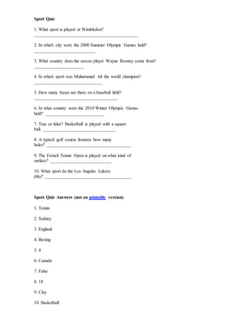 The document contains two quizzes with 10 multiple choice or true/false questions each about general knowledge and sports. The general quiz covers topics like the number of years in a millennium, details about the Beatles and Harry Potter, and the first element on the periodic table. The sports quiz asks about sports like tennis, the Olympics, golf, and basketball. Answers are provided but not printed with the questions.
