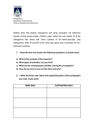 This document contains an English reading test on free time for students. It includes general instructions for taking the test, a reading passage about how people like to spend their free time, and several multiple choice and short answer questions about the reading. The reading passage discusses that rest and relaxation are important for health, and that people have free time to do activities they enjoy. It also mentions that current research in the US shows many young people enjoy outdoor activities, with 61% spending at least 2 hours outdoors on weekdays. The passage further discusses that playing video games and using computers are very popular activities among young people.